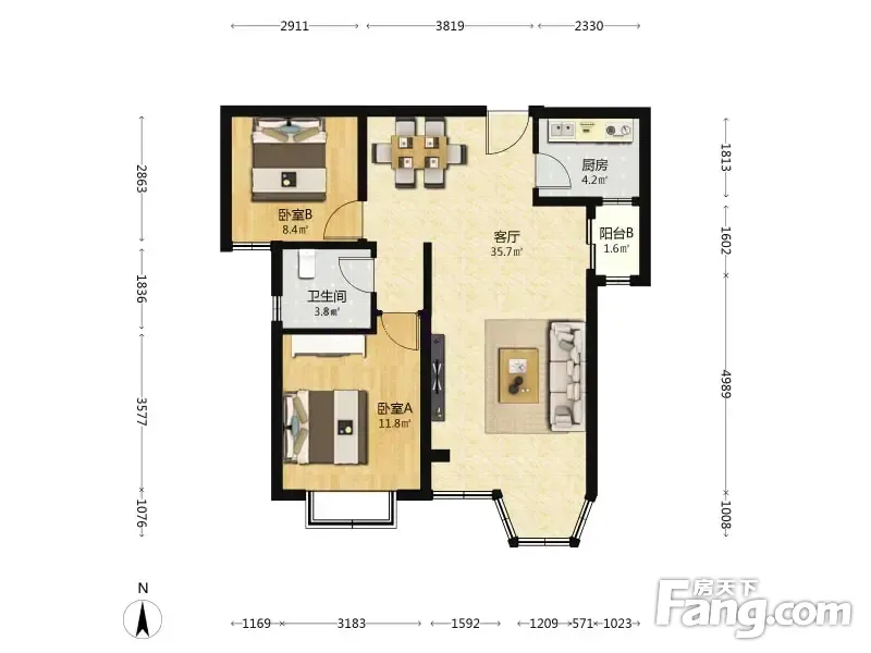 户型齐全,主打明厨,明卫,客厅朝南,全明格局,双卧朝南,主卧朝南二居