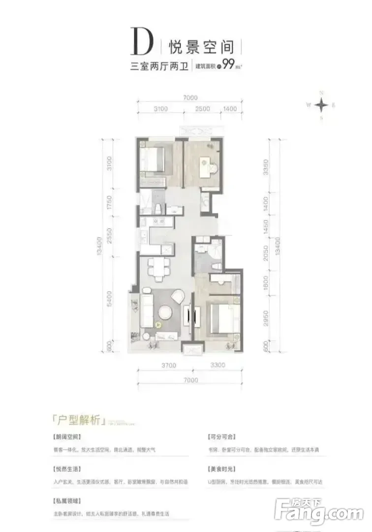 户型齐全,主打南北通透,客厅朝南,卧室朝南,U型厨房三居