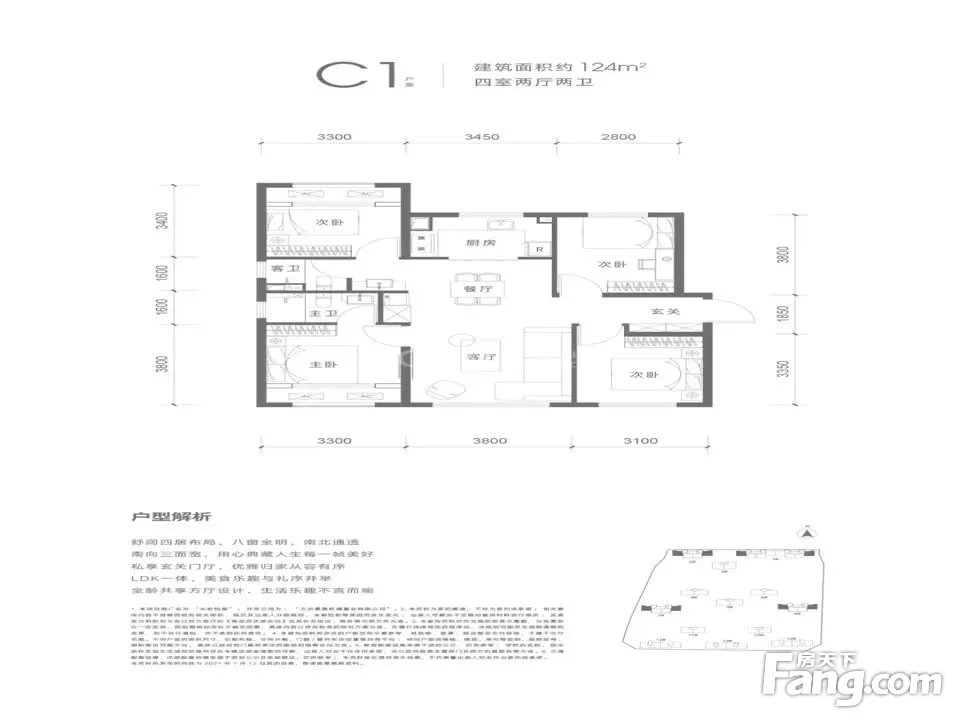 户型齐全,主打南北通透,客厅朝南四居