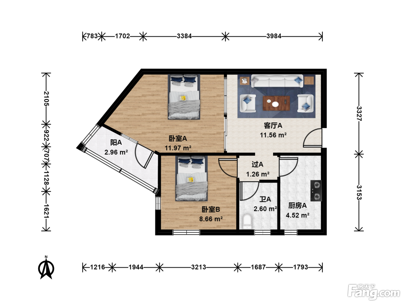 户型齐全,主打明厨,明卫,客厅朝南,双阳台二居