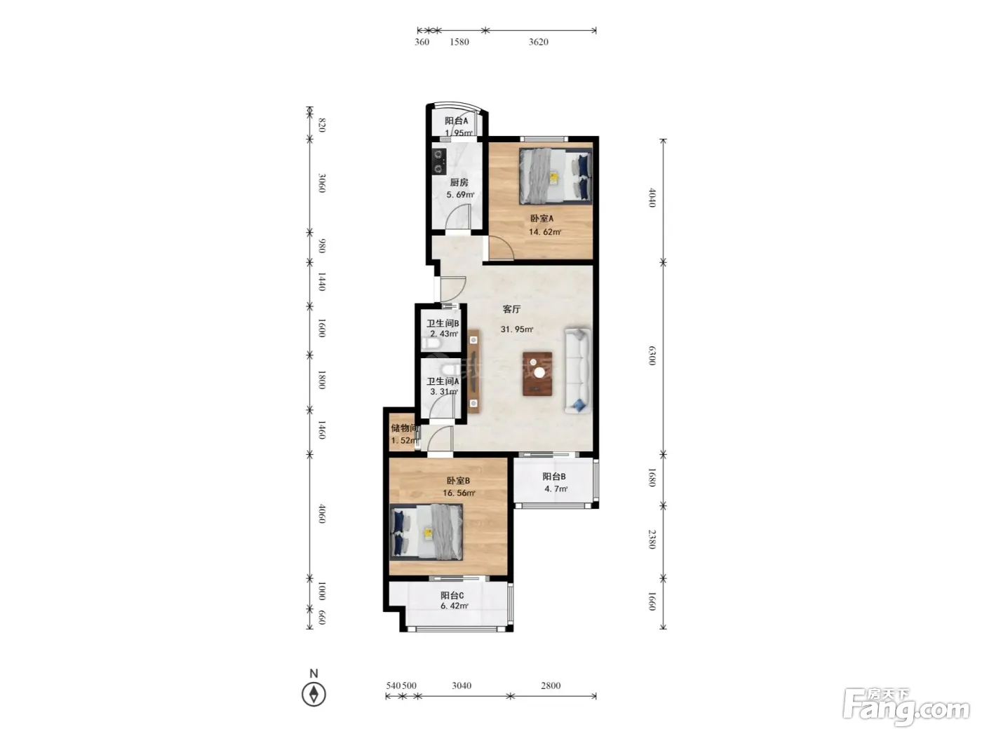 户型齐全,主打明厨,客厅朝南,双阳台,主卧朝南二居