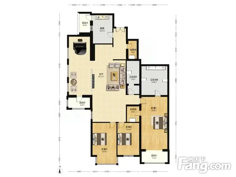 户型齐全,主打独立衣帽间,客厅朝南三居