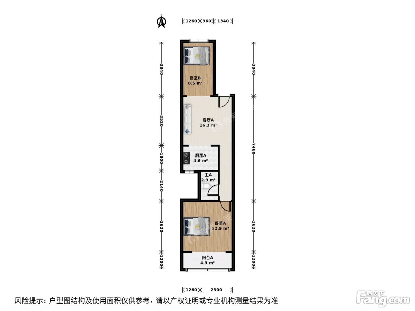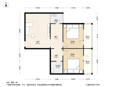 户型介绍:此房户型为2室1厅1卫,建筑面积为60平米,南北通透两居,经典格局,各功能区合理利用。客厅约13米,两个卧室净面积为15米和13米。厨房约5.5米宽敞舒适,洗手间约2.5米。空间布局合理,舒适