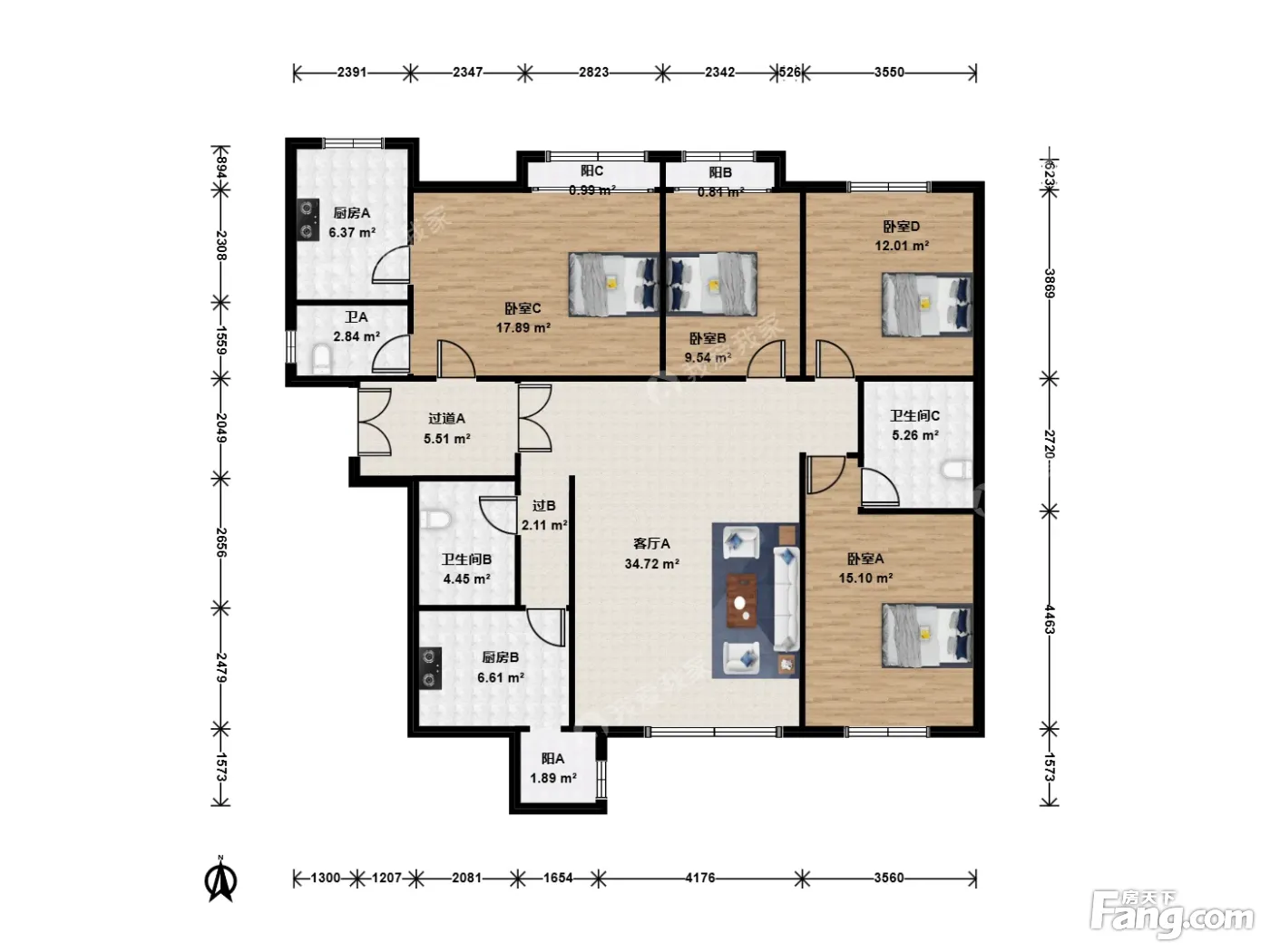 户型介绍:此房户型为4室1厅3卫,建筑面积为170.59平米,朝向为南北,4个卧室,3个卫生间,2个厨房,落地玻璃窗,无任何遮挡