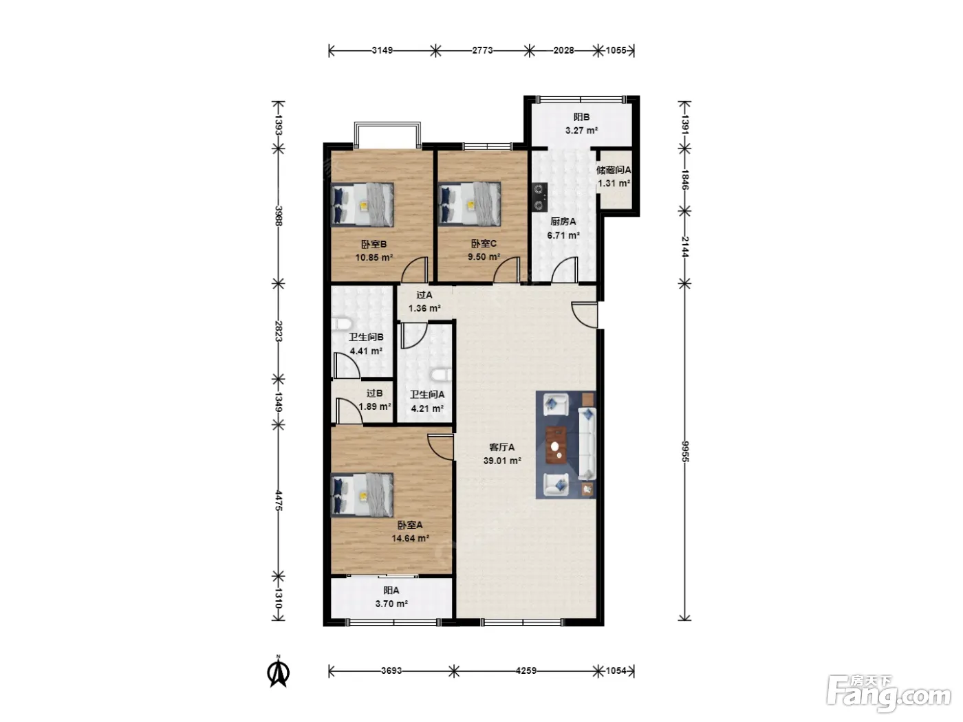 户型介绍:此房为南北朝向三室两厅双卫户型,格局方正,无面积浪费,两个卫生间均干湿分离设计,