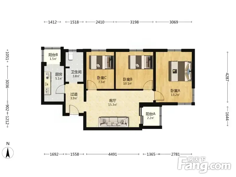 小区介绍小区是丰台城建开发建设的,物业是丰台城建自己的物业;供暖是集中供暖30元每平米,小区车位是租赁车位没有产权车位,地上车位150元每月 户型介绍房子是钢混结构的全全明格局三居室,客厅朝东向有阳台,主卧室东南北三面窗采光通风好,两个次卧室朝北向,厨房有北向阳台,卫生间有窗户通风换气好