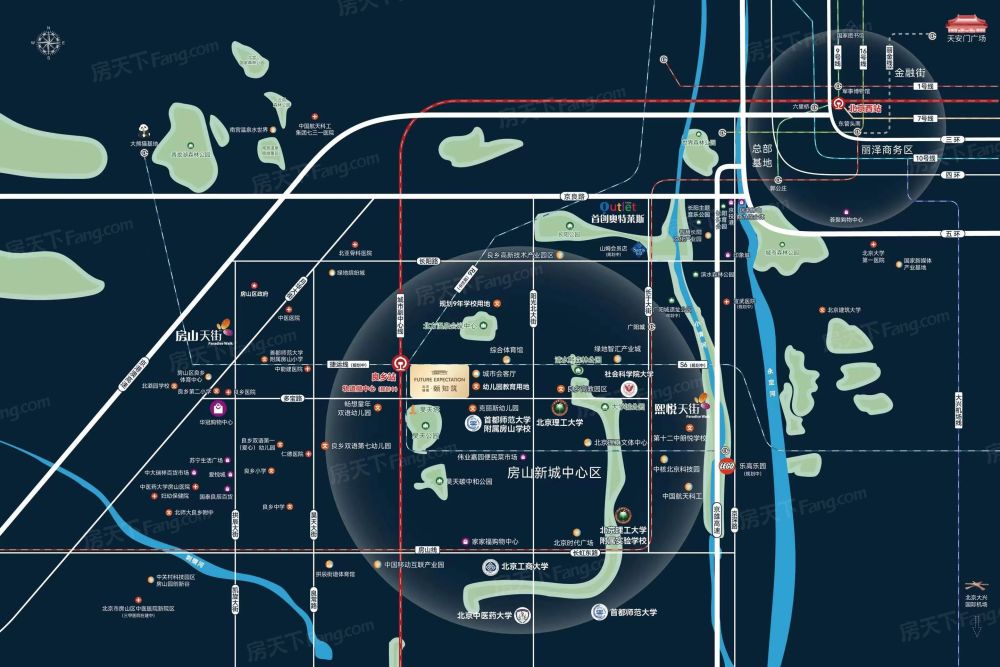 配套介绍 1. 交通现有S1(市郊铁路副中心线),27一站北京西站,可换乘7号线、9号线通达全城;76可达通州(北京城市副中心);S6(新城联络线),R6线(17号线支线)正在规划中; 2. 教育三公里内现有6家小学、10家中学、10家幼儿园;项目28地块东侧,我们将代建1所幼儿园,东北侧600米处,还有一处幼儿园、小学、中学的规划用地 3. 医疗北京中能建医院、北京房山区中医医院月华分院、北京仁德医院、良乡医院、鹏园医院、妇幼保健院、北亚骨科医院,同时区域内的北京中医药大学房山医院、首都医科大学宣武医院房山院区等三甲医院,为您和家人的健康保驾护航。 4. 商业3公里内