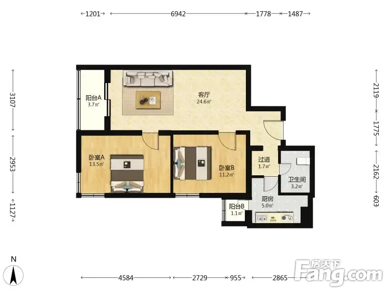 钟界沸0.5 大龙公寓 2室1厅 85.54平