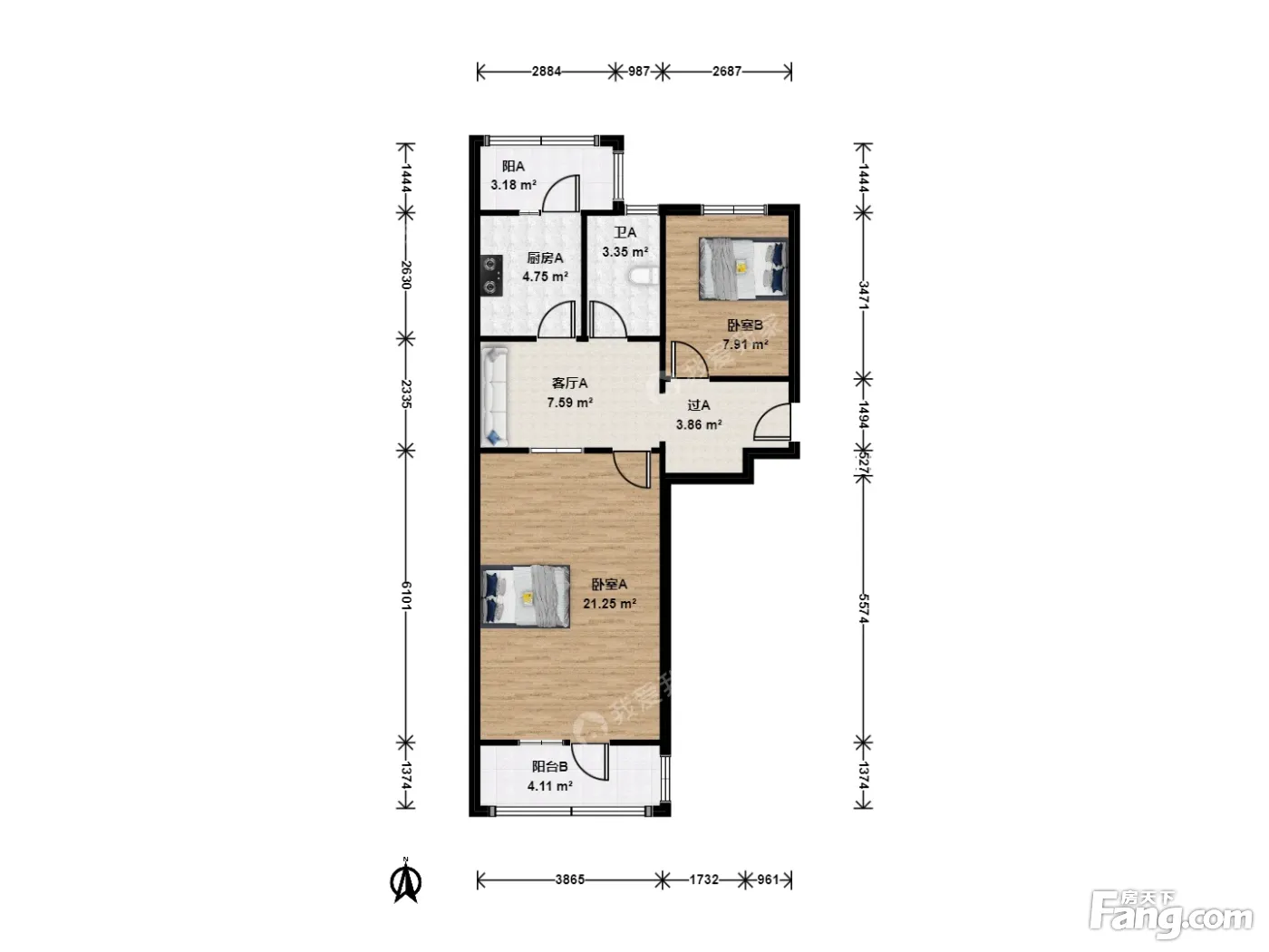 户型介绍:主卧朝南带阳台,次卧和出房朝北,客厅在中间。但是客厅和主卧连接的墙体非实体墙,可以进行修改。户型方正,没有浪费的面积。