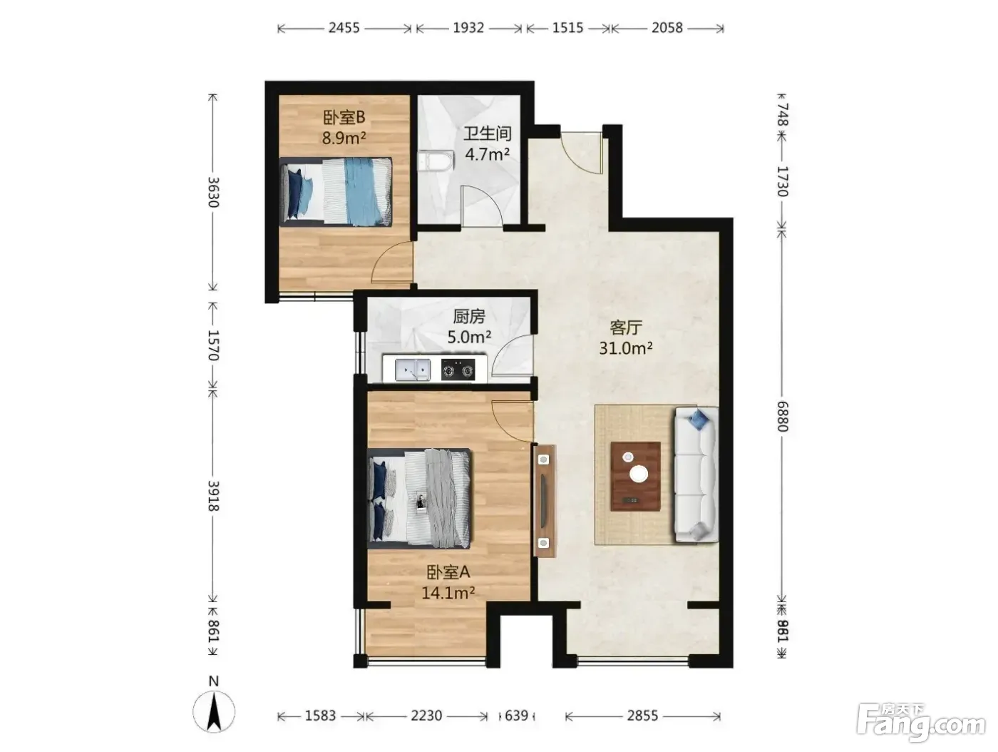 户型齐全,主打户型方正,明厨,客厅朝南,主卧朝南二居