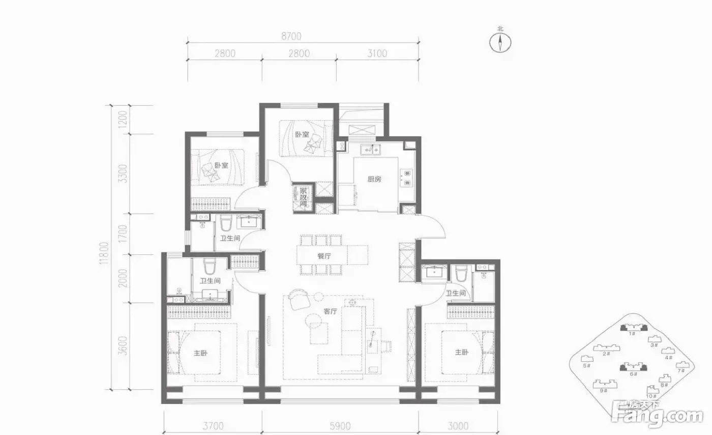 户型齐全,主打南北通透,客厅朝南三居