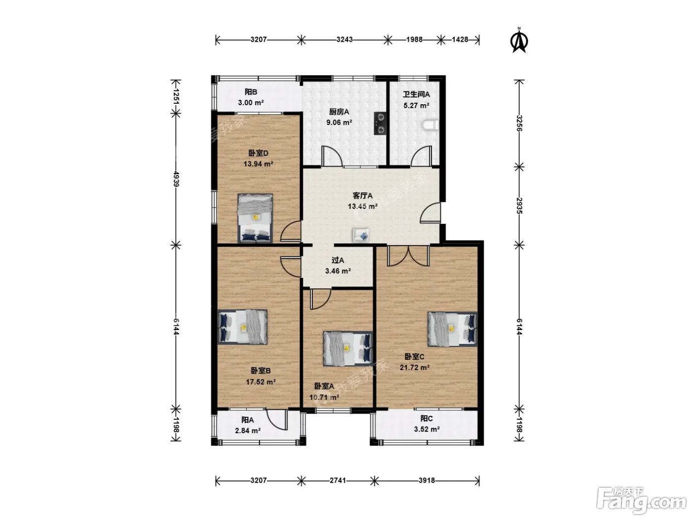 户型介绍:此房户型为4室1厅1卫,建筑面积为134.13平米,朝向为南北。房子是南北双通透三居双卫,主卧客厅带大阳台朝南,双卧朝南,次卧朝北带阳台带西窗,采光视野特好,厨房卫生间朝北。全名格局。