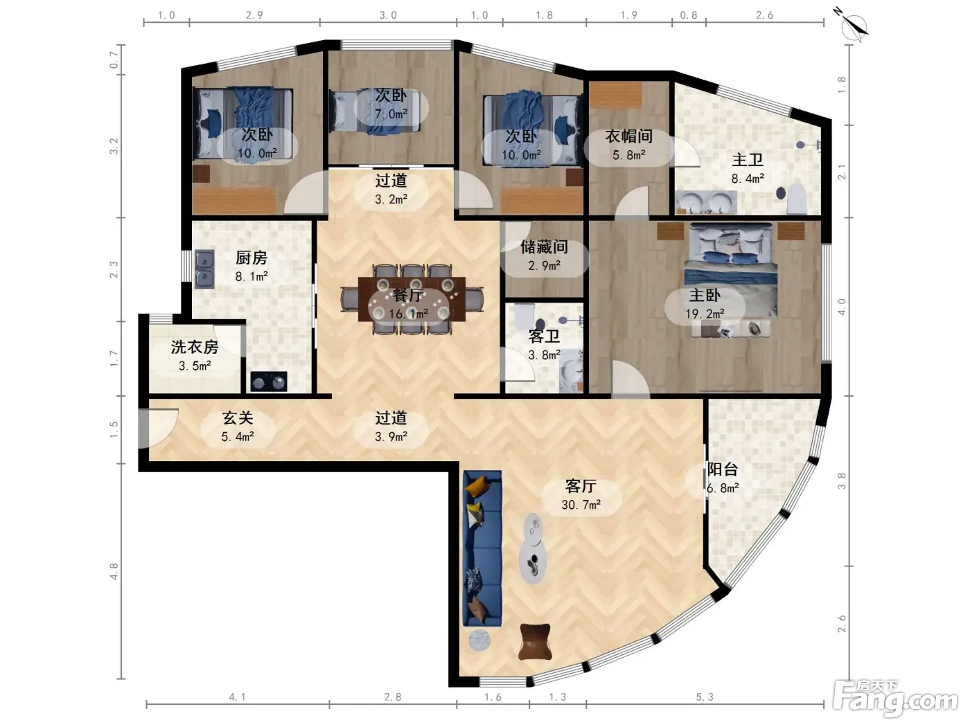 户型齐全,主打户型方正,明卫,明厨,独立衣帽间,客厅朝南,全明格局,主卧朝南三居