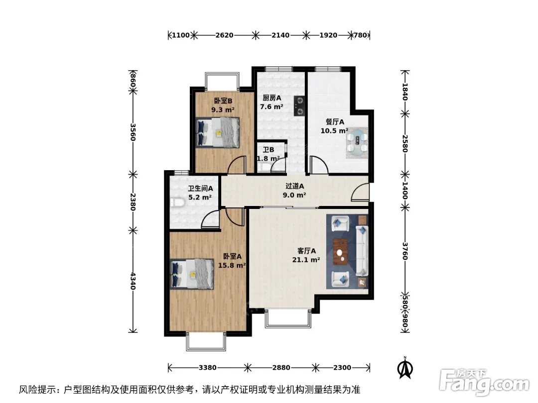 此房户型方正 板楼 公摊小 南北通透 一层 边户 全明大3居 布局合理 无浪费面积 采光无遮挡
