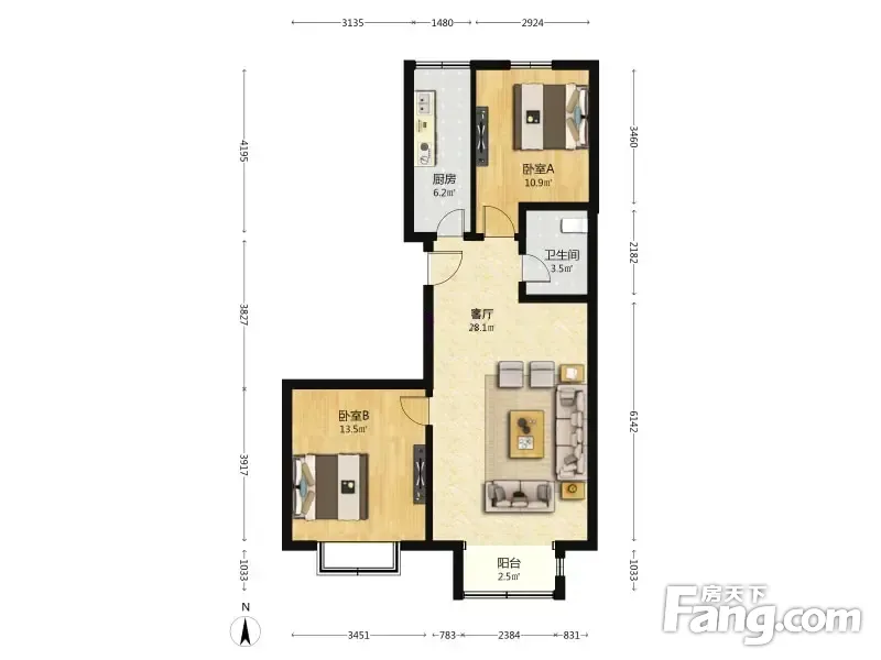 户型齐全,主打户型方正,明厨,客厅朝南,双阳台二居