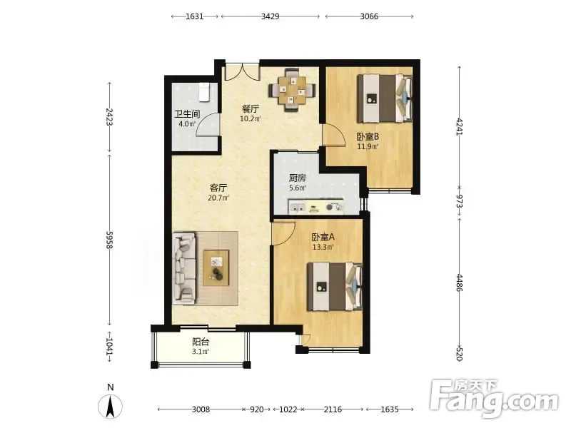 户型齐全,主打户型方正,明厨,客厅朝南,主卧朝南二居