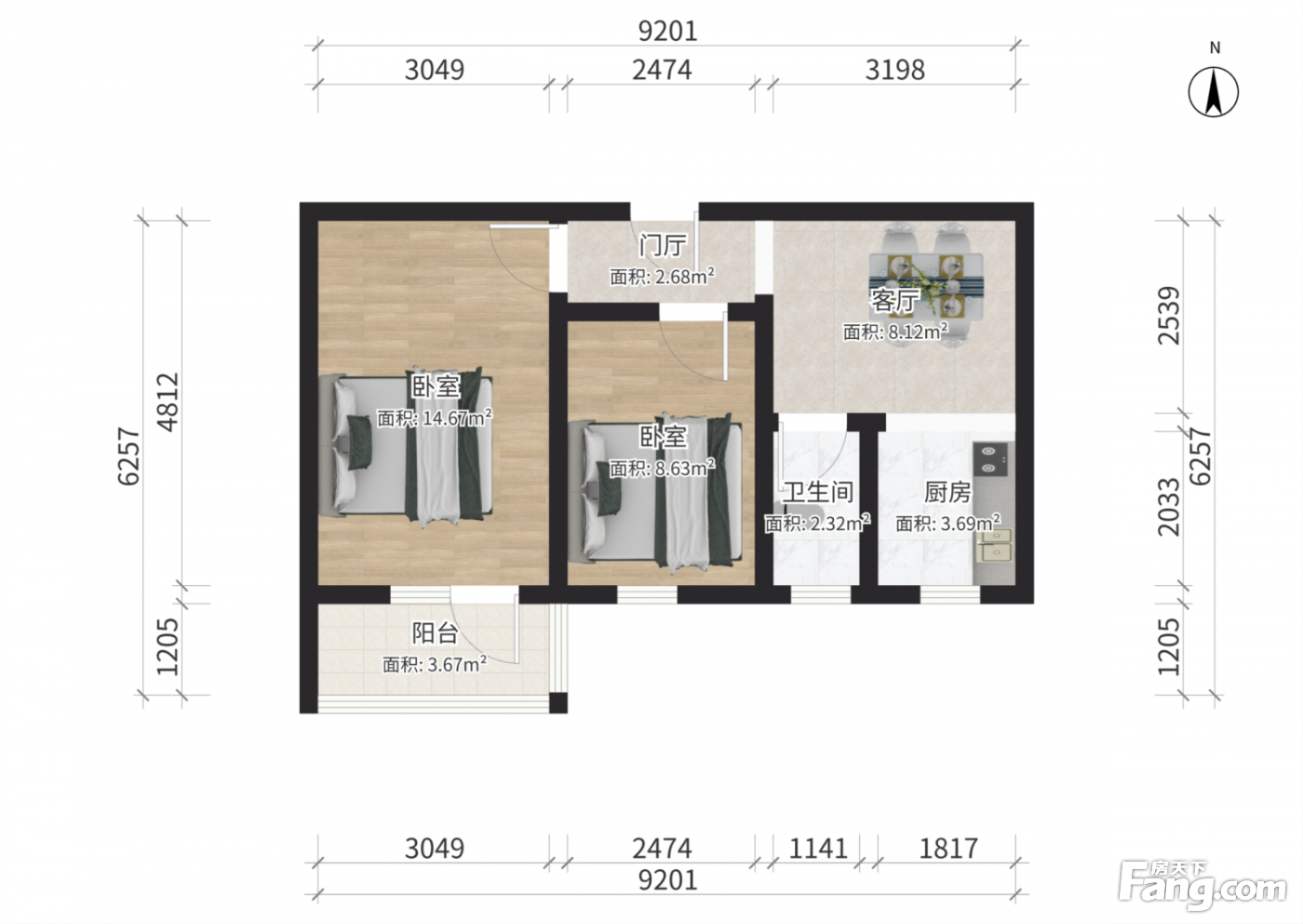 户型齐全,主打双卧朝南,主卧朝南二居