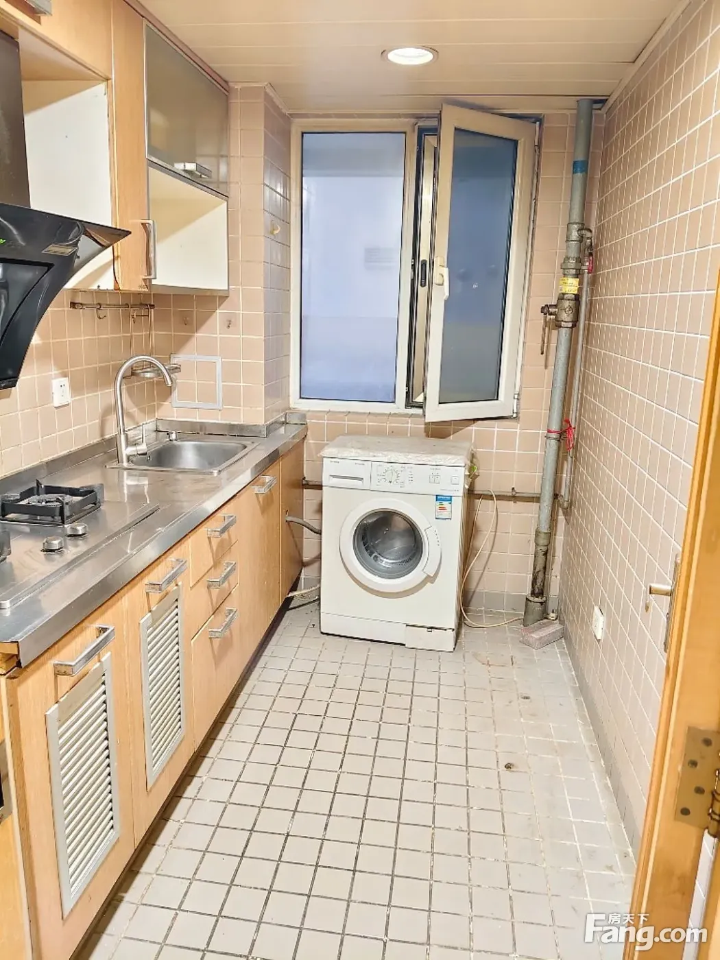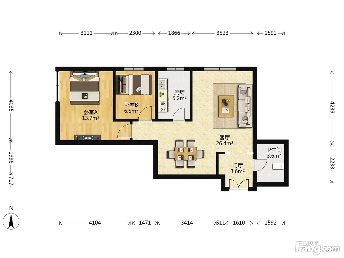 房子是个大两居 进门有玄关 客厅约26平米 主卧朝西次卧朝北 厨房朝北有窗户 卫生间干湿分离