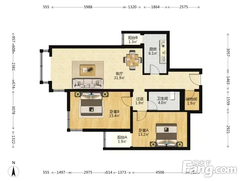户型齐全,主打客厅朝南二居