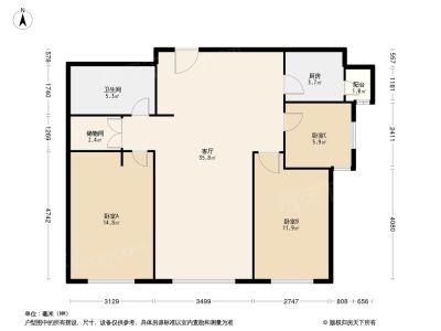 户型介绍:此房户型为3室1厅1卫,建筑面积为89.16平米,朝向为南北。 本房格局方正,无浪费面积,有多个位置都不计入房本面积,使用空间大。主卧室客厅朝南,两间卧室朝北,通透性好,居住舒适