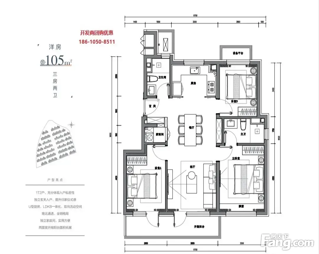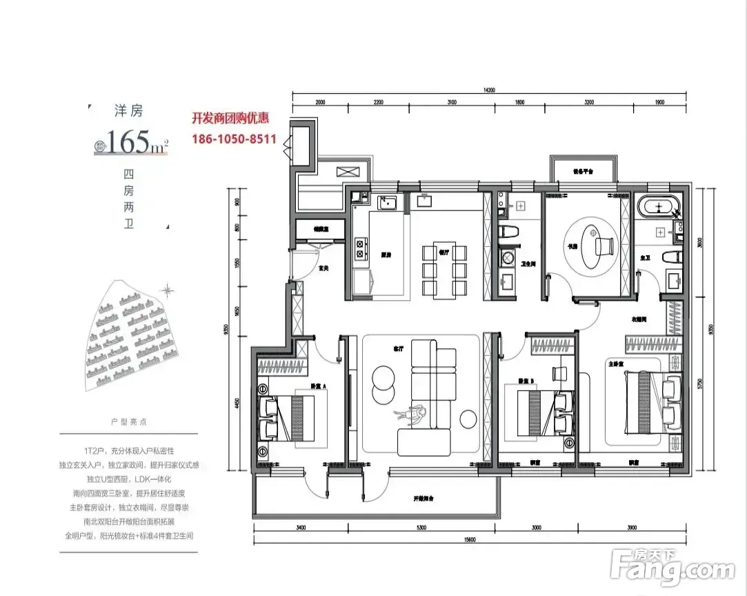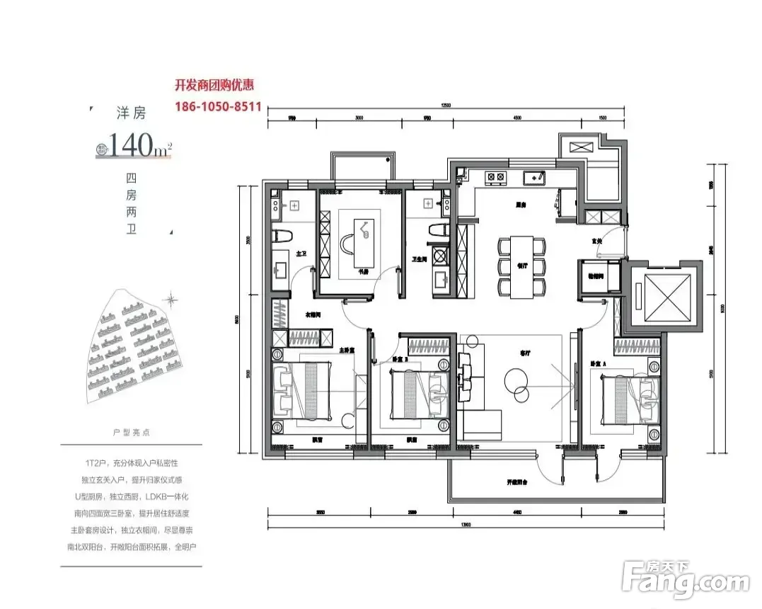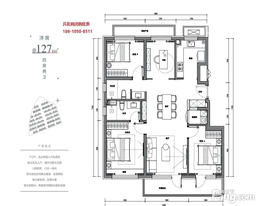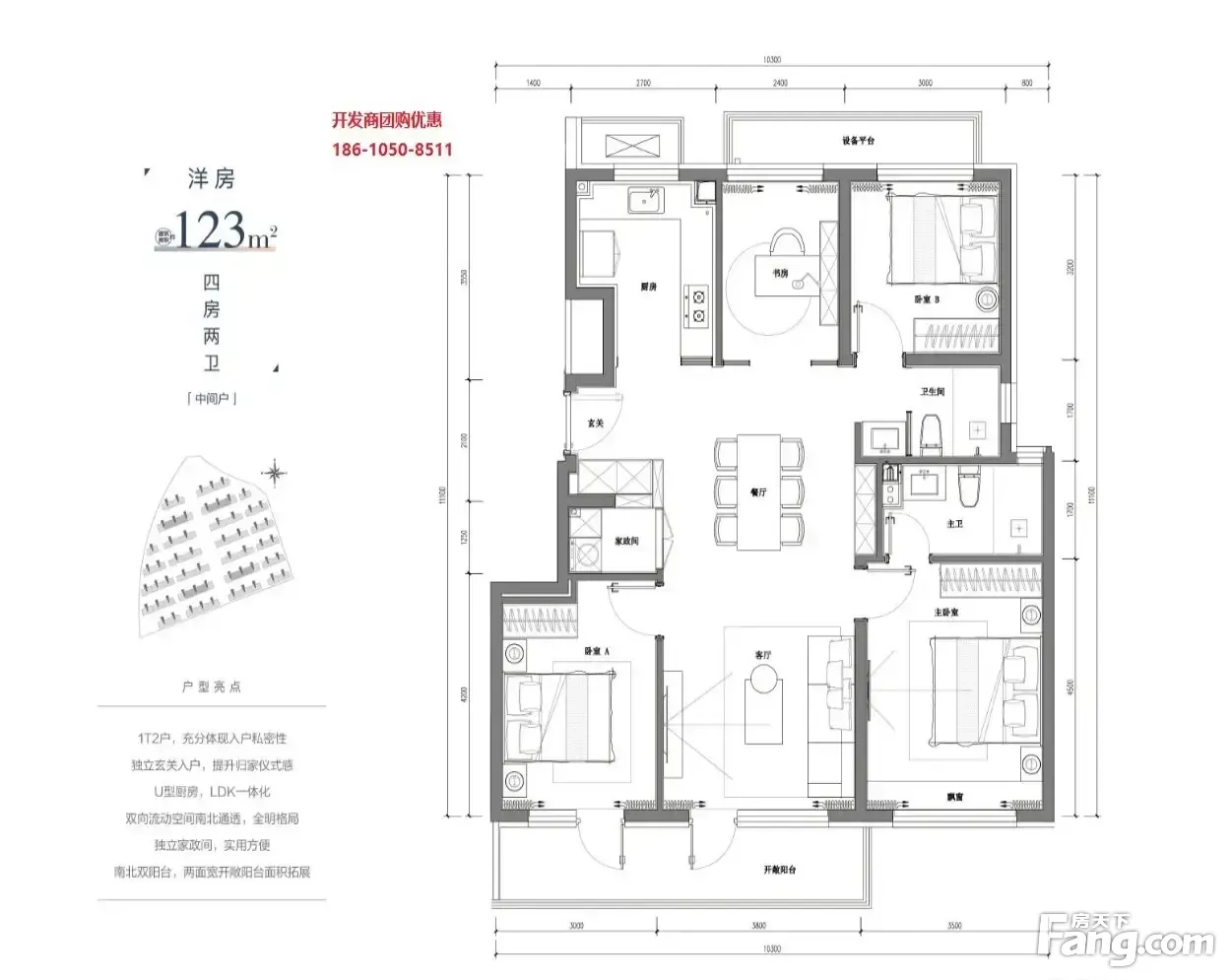 户型齐全,主打南北通透,全明格局,采光充足,客厅朝南,主卧套间,U型厨房四居
