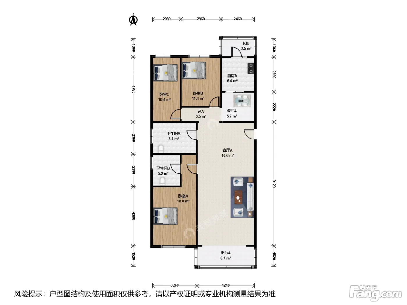 户型介绍:此房户型为3室2厅2卫,建筑面积为147.95平米,朝向为南北,主卧和客厅朝南,2次卧朝北,。