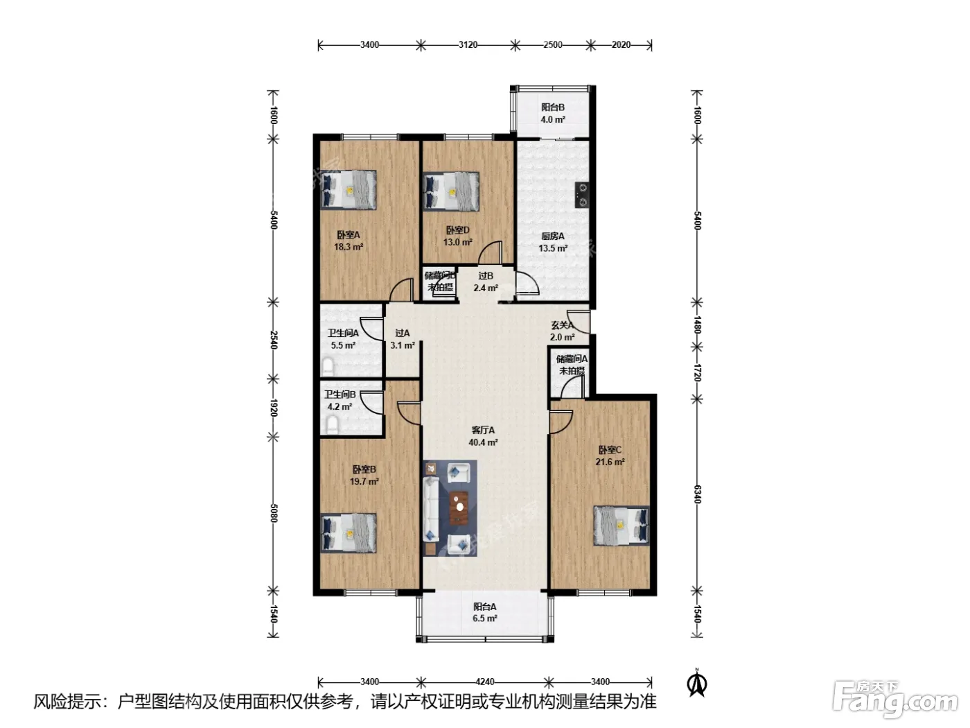 户型介绍:此房户型为4室2厅2卫,建筑面积为195.62平米,朝向为南北。主卧室、客厅和大次卧朝南,三面朝阳,两个次卧室和厨房朝北,客厅带落地阳台,厨房带阳台。一梯两户。