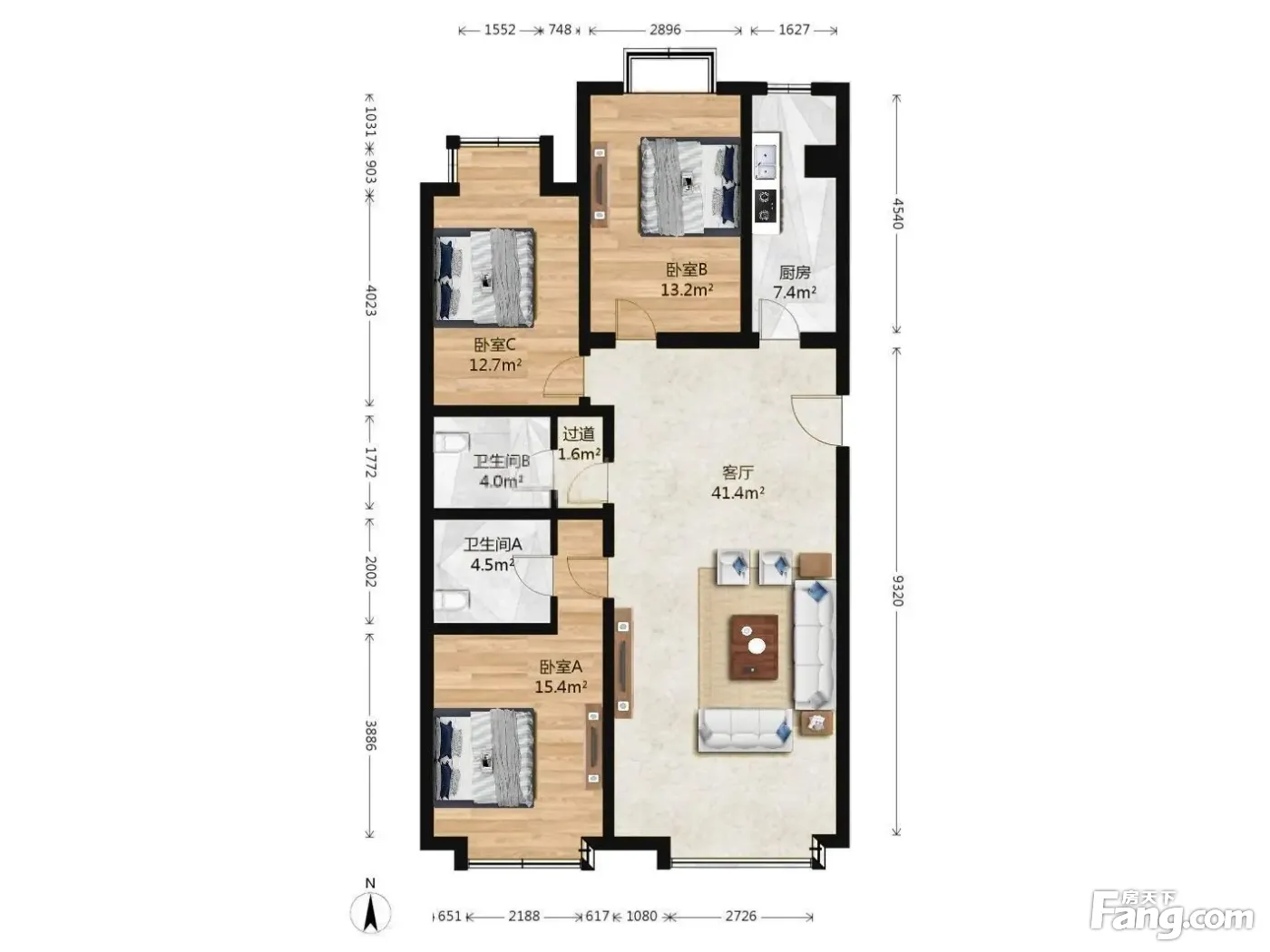 户型介绍:此房为南北通透三居,客厅和主卧朝南,两个卧室朝北,厨房朝北,有单独阳台,两个卫生间都很大。