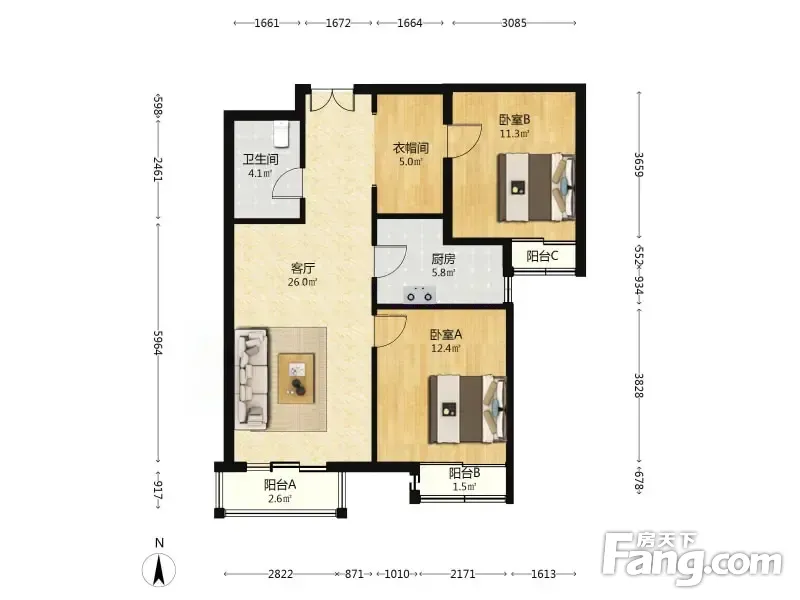 户型齐全,主打户型方正,明厨,客厅朝南,主卧朝南二居