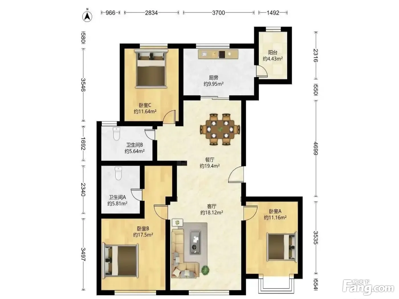 户型齐全,主打南北通透,客厅朝南三居