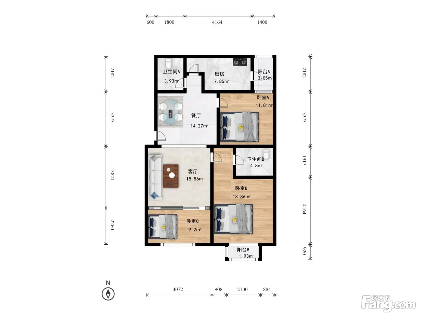 户型介绍:本房为南北两居,两卫,空间无浪费,面积131.02平米。