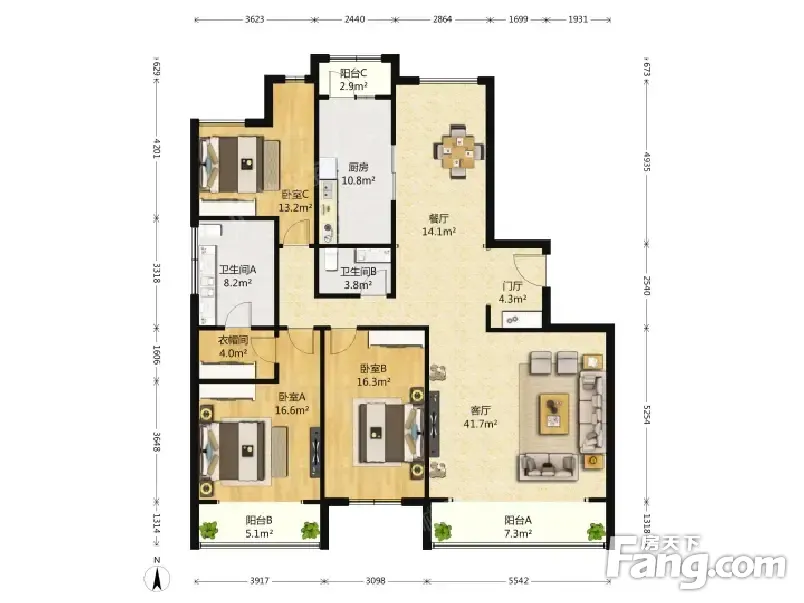 户型齐全,主打户型方正,独立衣帽间,明卫三居