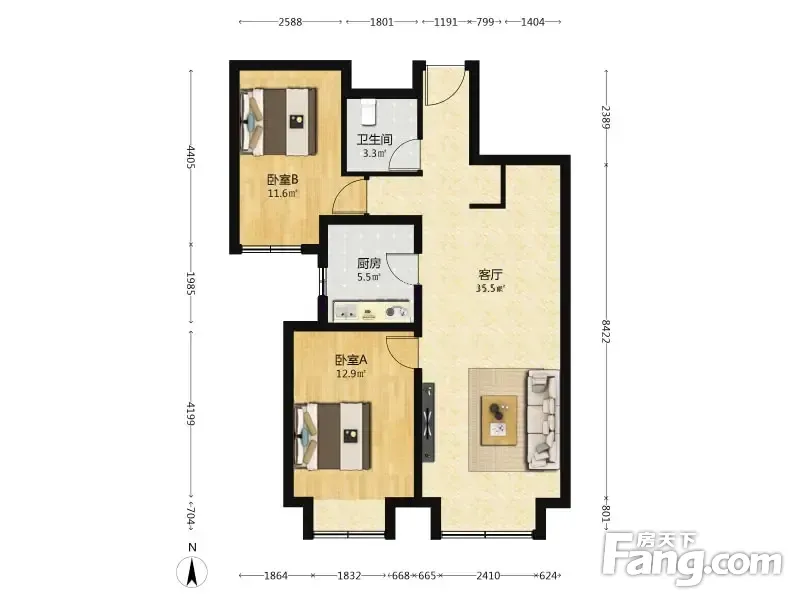 户型齐全,主打南北通透,客厅朝南二居