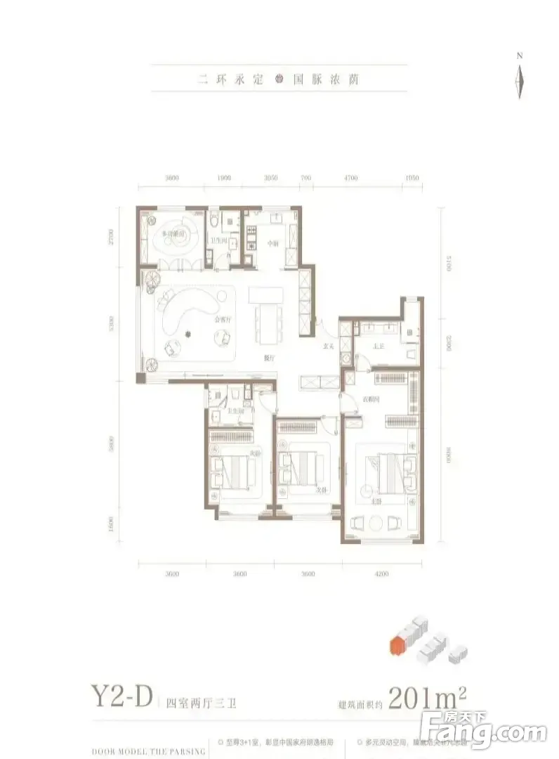 永定樾户型主要有143平-152平的南北通透,采光充足,客厅朝南的三居 、198平-201平的南北通透,全明格局,动静分离,采光充足的四居 。