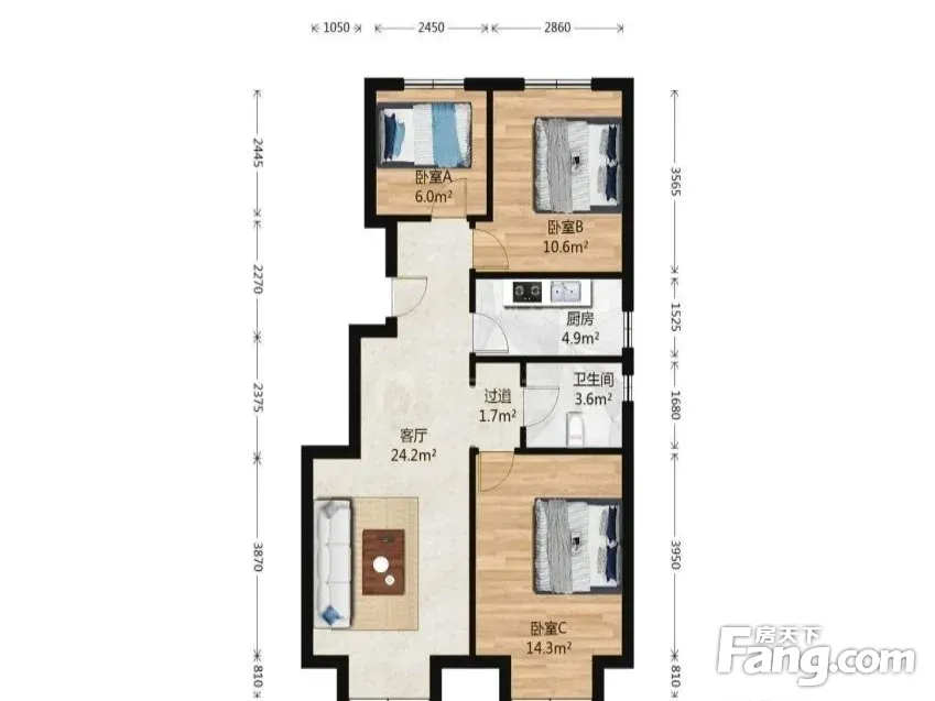 户型介绍:客厅朝南,主卧朝南,两个 次卧朝北,户型方正,厨房、卫生间带窗户,全明格局