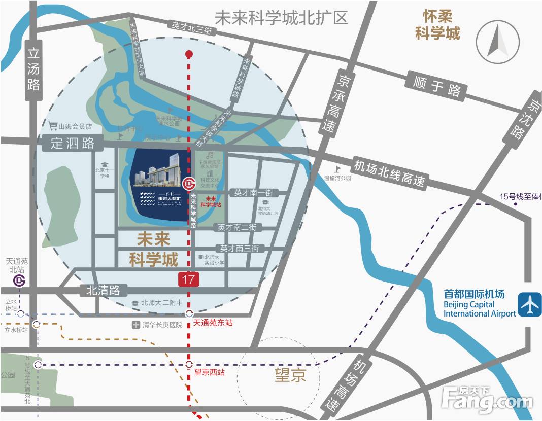 交通情况 公路:京承高速,北六环,机场北线,定泗路 地铁:17号线“未来科学城南”站 公交:487路、昌63路、 昌27路、417路、专42路等公交。