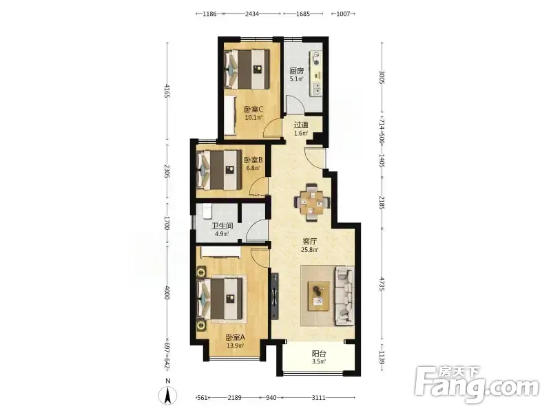 户型齐全,主打南北通透,主卧带卫,干湿分离三居