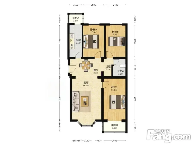 车站北里 3室1厅 101.48平 南北通透三居室采光无遮挡