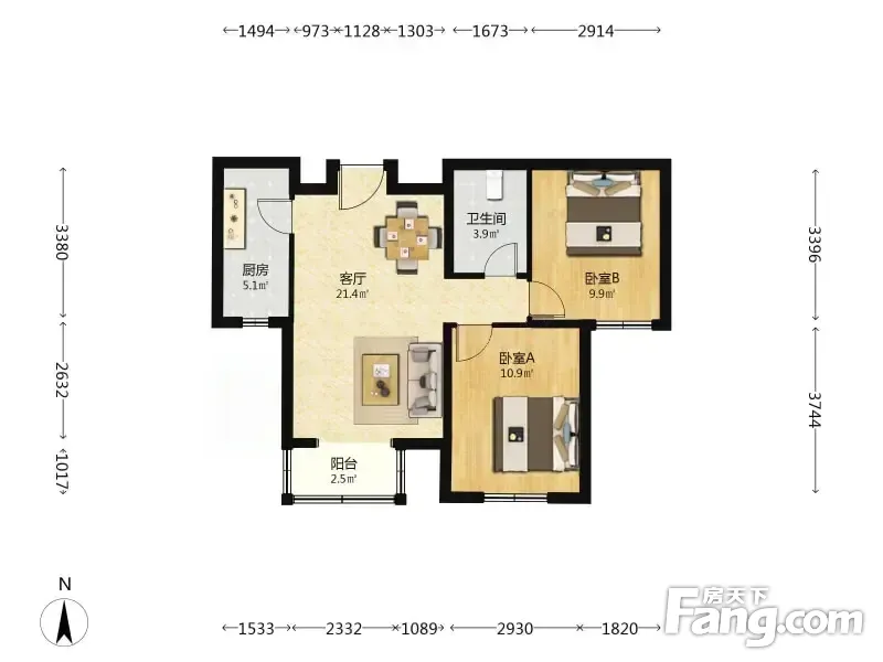 三合北巷7号院 2室1厅 76.74平 全南向采光充足无遮挡