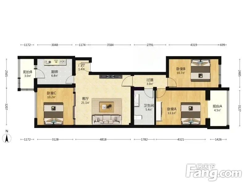 泰中花园 2室2厅 106.24平 正规三居室户型方正采光好