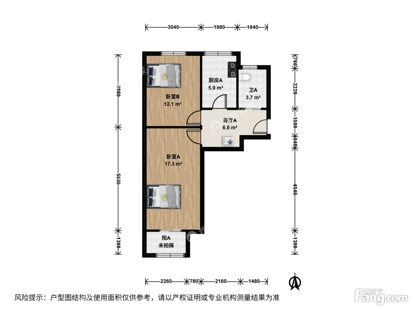 户型齐全,主打明厨,客厅朝南,双卧朝南二居