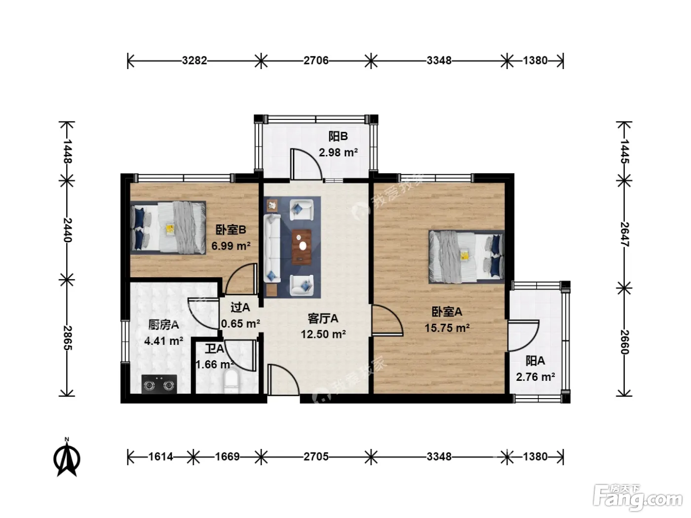 户型齐全,主打明厨,客厅朝南,双卧朝南二居