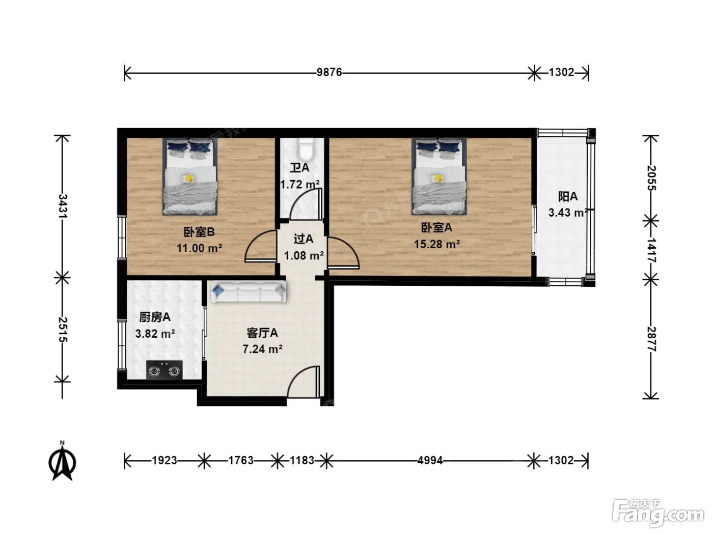 户型齐全,主打明厨,客厅朝南,双卧朝南二居
