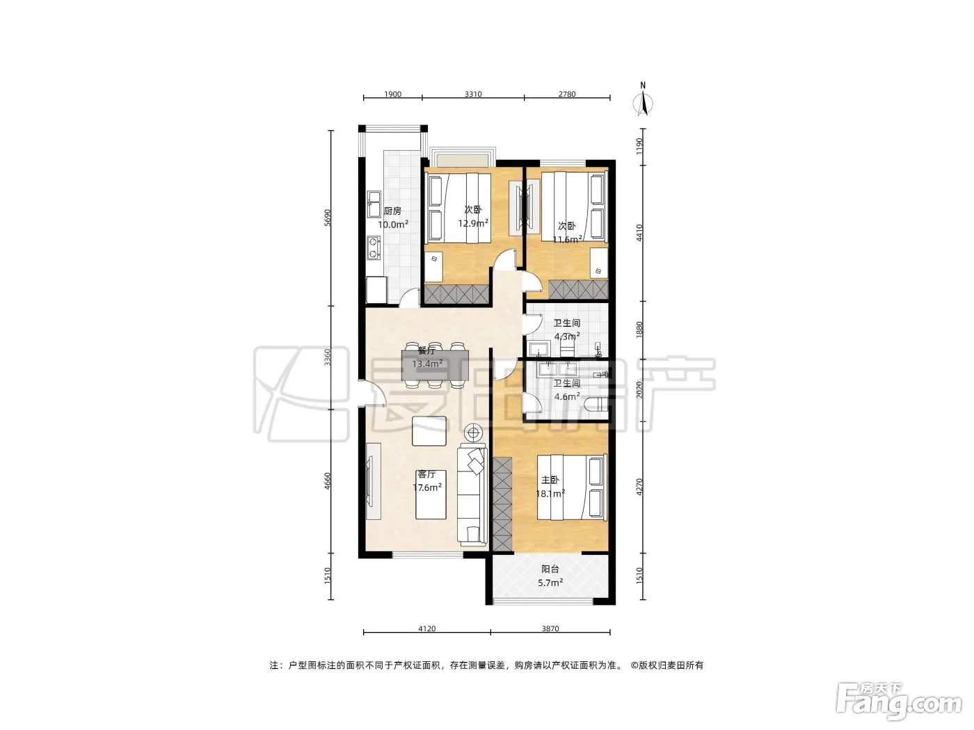 1.主卧客厅朝南,两个卧室和厨房朝北,客厅带外置大阳台,主卧面积17平米,客厅面宽4.5米,两个次卧分别是13平米和14平米
