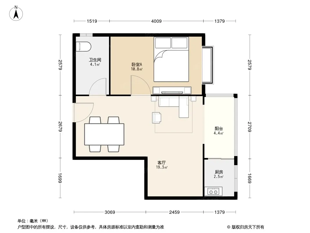 大开间,大落地窗户型方正。