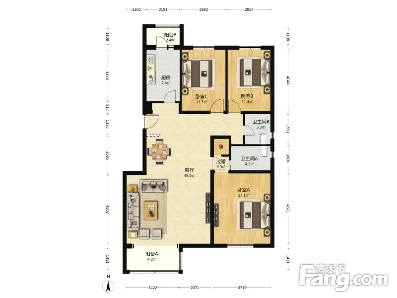 户型齐全,主打明卫,独立衣帽间,客厅朝南三居