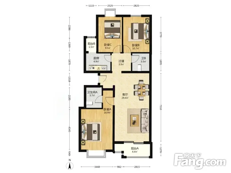 户型齐全,主打户型方正,明厨,主卧朝南二居