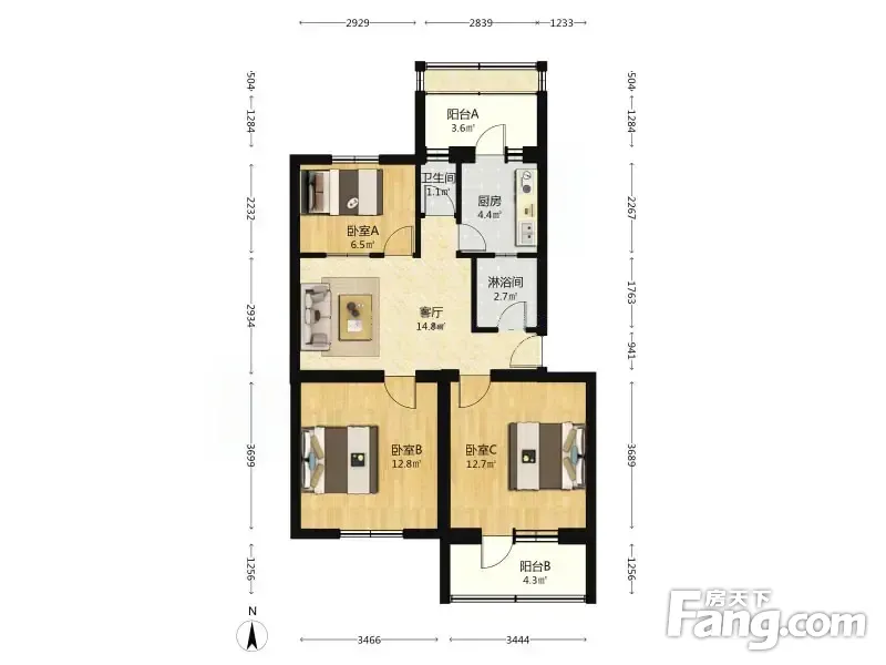 北大地三里16号院 3室1厅 80.57平
