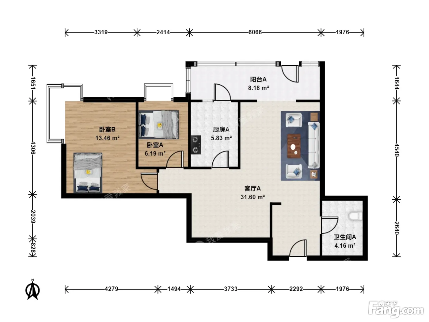 户型齐全,主打客厅朝南二居