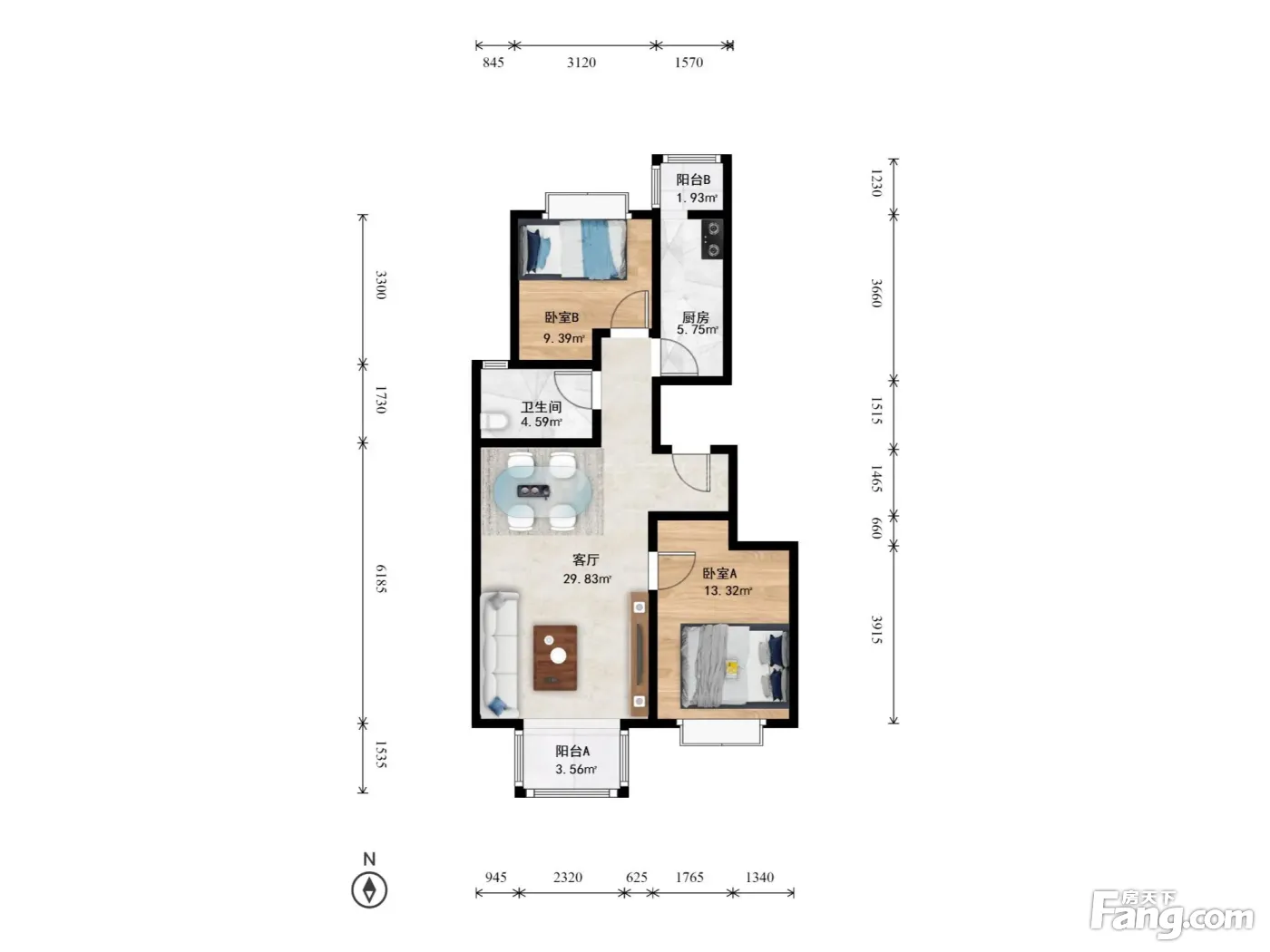 户型齐全,主打明厨,客厅朝南,双阳台二居